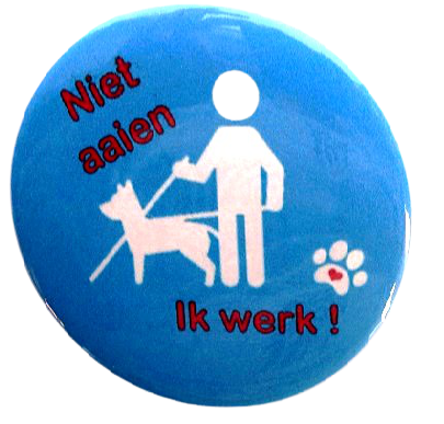Super leuk en een gegarandeerd succes is deze button hulphond. De button wordt standaard geleverd in 5 cm drie afbeeldingen mogelijk, kijk bij optie welke u wenst. Je kunt ze op het tuig van je hond spelden, of op je eigen jas of tas.