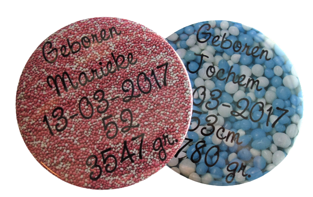 Uw geboortegegevens zichtbaar met onze buttons! De button kan worden gemaakt naam, geboortedatum, gewicht en lengte. Ze zijn verkrijgbaar in 5 cm, of in 7,5cm. De buttons zijn verkrijgbaar in 4 uitvoeringen: muisjes blauw, muisjes roze, voetjes blauw en voetjes roze, ze worden per stuk verkocht. De maximale lengte van de naam is 15 tekens. Hoe langer de naam, hoe kleiner het lettertype.