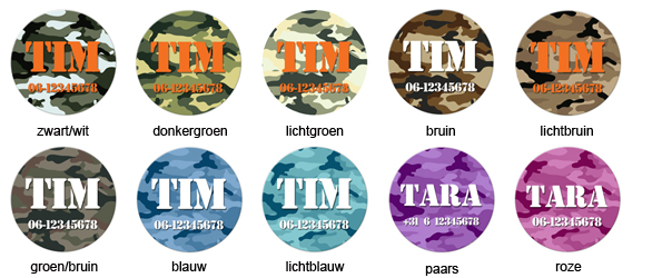 Altijd uw naam en/of telefoonnummer zichtbaar met onze buttons! De button kan worden gemaakt met naam en/of uw telefoonnummer. Ze zijn verkrijgbaar in 2 maten, namelijk 3,8 cm en 5 cm. De buttons zijn verkrijgbaar in 10 hippe en trendy kleuren en worden verkocht per set van 4 stuks. De maximale lengte van de naam is 15 tekens. Hoe langer de naam, hoe kleiner het lettertype.