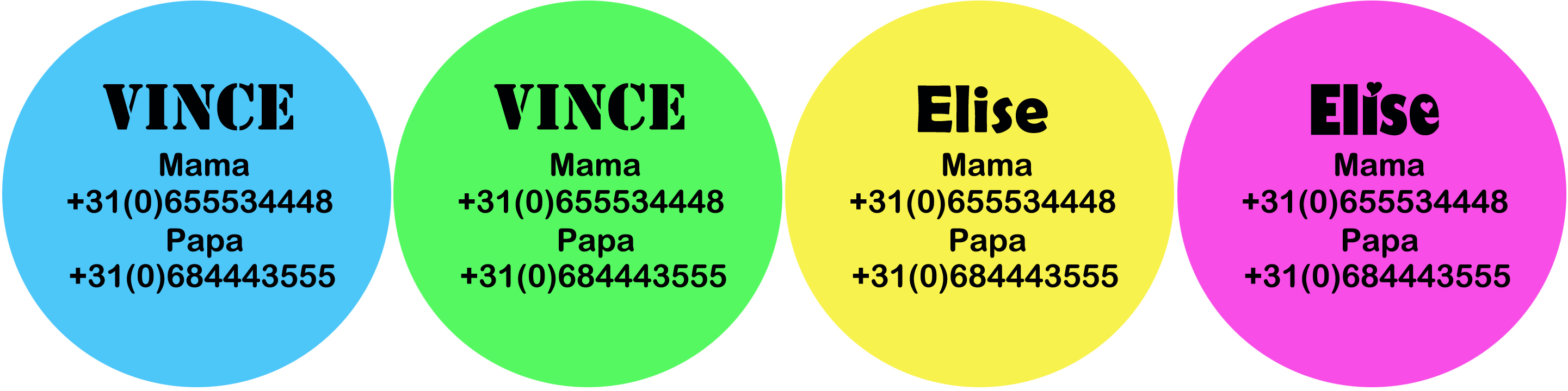 Altijd uw naam en telefoonnummer zichtbaar met onze buttons! De button kan worden gemaakt met naam en/of uw telefoonnummer. De buttons zijn verkrijgbaar in 4 designs en worden per stuk verkocht. De maximale lengte van de naam is 15 tekens. Hoe langer de naam, hoe kleiner het lettertype.