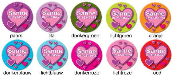 Altijd uw naam en/of telefoonnummer zichtbaar met onze buttons! De button kan worden gemaakt met naam en/of uw telefoonnummer. Ze zijn verkrijgbaar in 2 maten, namelijk 3,8 cm en 5 cm. De buttons zijn verkrijgbaar in 10 hippe en trendy kleuren en worden verkocht per set van 4 stuks. De maximale lengte van de naam is 15 tekens. Hoe langer de naam, hoe kleiner het lettertype.
