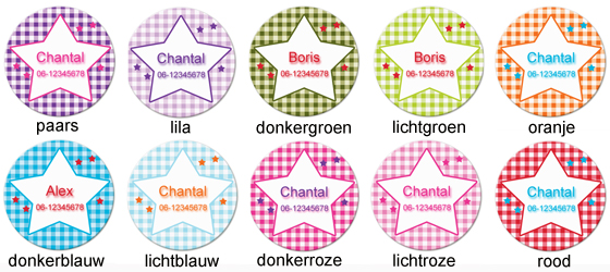 Altijd uw naam en/of telefoonnummer zichtbaar met onze buttons! De button kan worden gemaakt met naam en/of uw telefoonnummer. Ze zijn verkrijgbaar in 2 maten, namelijk 3,8 cm en 5 cm. De buttons zijn verkrijgbaar in 10 hippe en trendy kleuren en worden verkocht per set van 4 stuks. De maximale lengte van de naam is 15 tekens. Hoe langer de naam, hoe kleiner het lettertype.