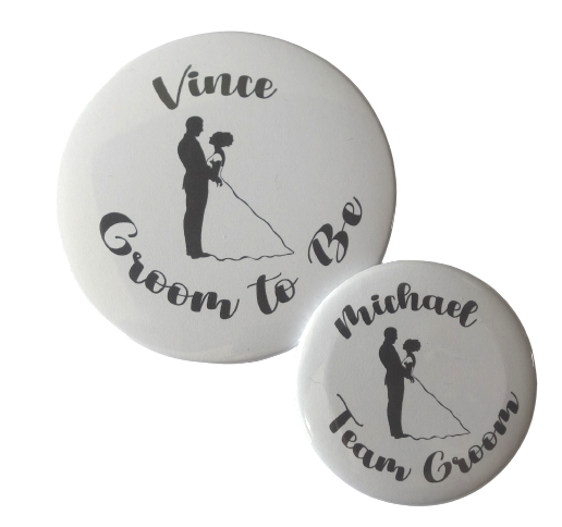 Deze grote button 7,5cm kunt u los bestellen, de buttons team groom 5cm kunt u voor een meerprijs meebestellen.