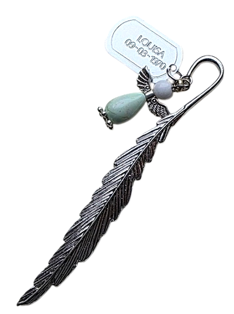 Leuke boekenlegger gepersonaliseerd met eigen tekst, en engel en kwast naar keuze. Leuk om bijvoorbeeld samen met een boek cadeau te geven. Maat boekenlegger 20 cm. Ze zijn in 4 uitvoeringen verkrijgbaar: rood, medow green, roze en turqoise blauw. Er passen 2 regels tekst op á 12 tekens per regel. Voorbeeldmodel heeft een naam en een geboortedatum.