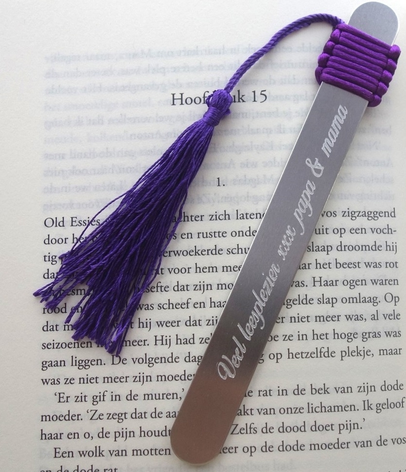Leuke boekenlegger gepersonaliseerd met eigen tekstregel en gekleur koord met kwast.