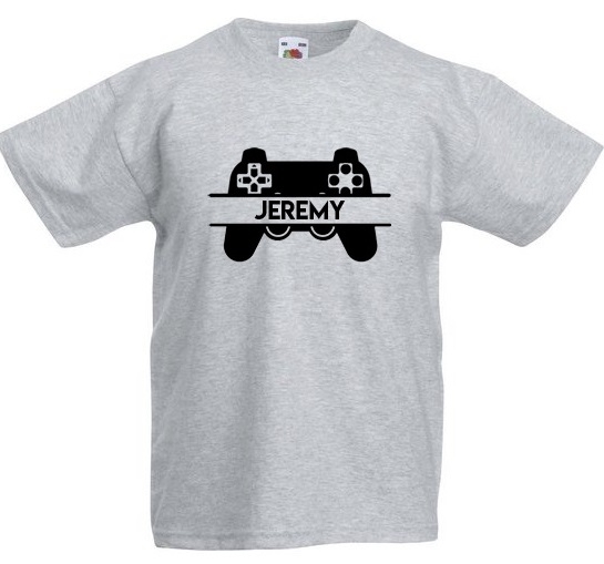 t-shirt bedrukt met naam en afbeelding controller voor kinderen. Drie verschillende controllers mogelijk.