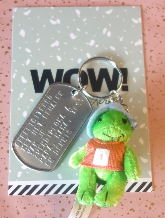 Leuke sleutelhanger met kikker en dogtag met tekt naar keuze.
