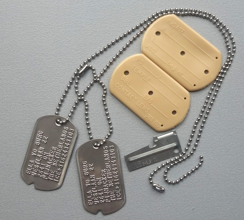 Dogtags model met hapje eruit.  Op de tags werd gedrukt: achternaam, voornaam, BSN nummer, bloedgroep en geloof. Uiteraard kun je op deze tags ook je eigen tekst. Complete set met originele silencer en mesje P-38.