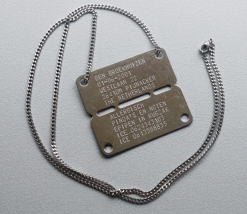 Op de Dutch Army Tag kunnen maximaal 19 karakters geplaatst worden. Er is ruimte voor 5 regels van 19 tekens (inclusief de spaties). Bij de Dutch Army Dog Tag ontvangt u standaard een ketting van 70 cm.