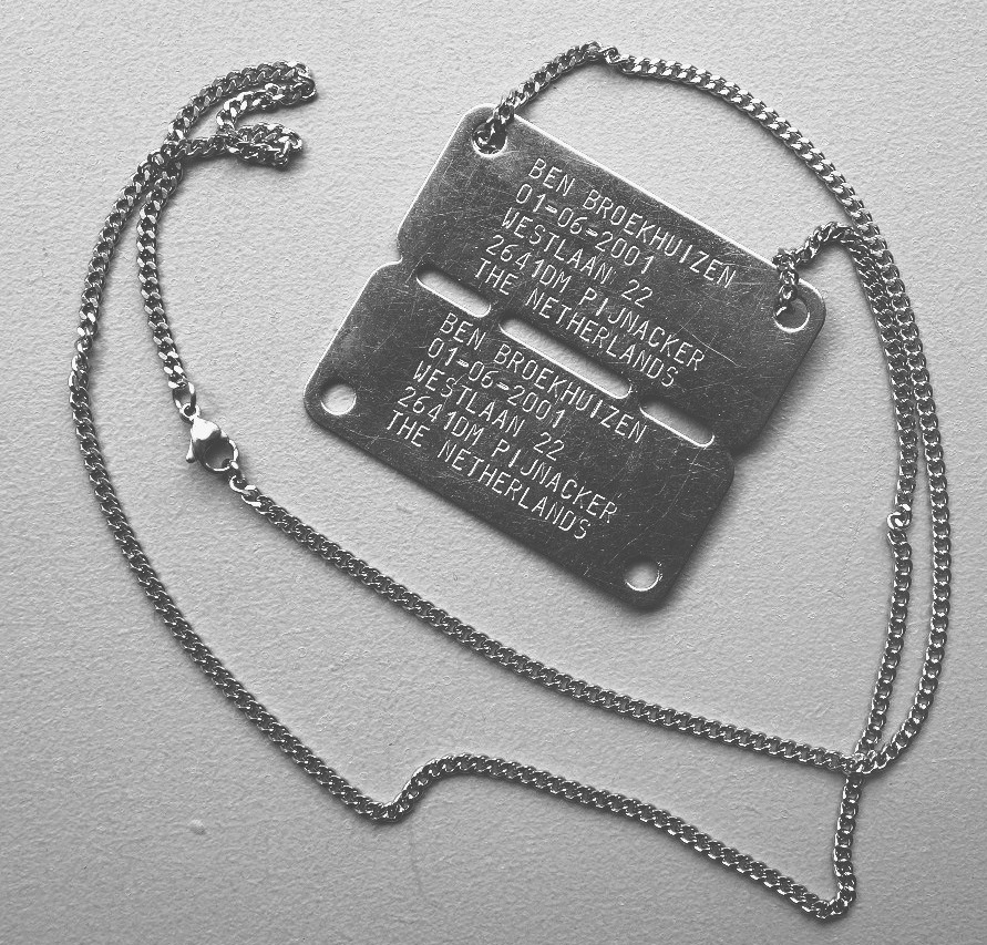 Deze originele Dutch Army Tag zijn twee identiteitsplaatjes aan elkaar. De tekst wordt zowel op de bovenste helft als op de onderste helft afgedrukt. Materiaal roestvrijstaal. Formaat: 5,7 cm breed, 5 cm hoog.