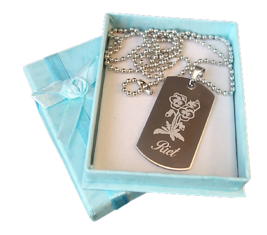 Gegraveerd identiteitsplaatje RVS met afbeelding geboortebloem in roestvaststaal hoogglans met ketting naar keuze.  Maat plaatje 5 cm inclusief oog, breedte 2,5 cm. Voorzijde tag is hoogglas, achterzijde is gematteerd.