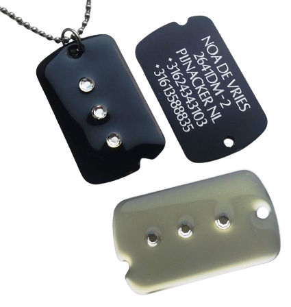 Het identiteitsplaatje is gemaakt van stevig aluminium. U heeft de keuze uit de kleur zwart of zilver en diverse soorten kettingen. Deze gravering wordt er met diepte ingegraveerd.