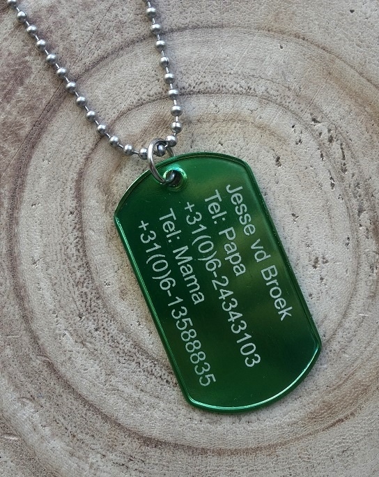 Het identiteitsplaatje is gemaakt van stevig aluminium.  Ook diverse kleuren kettingen. Het universele kogelkettinkje zal bij te hoge belasting breken, dus is veilig voor jong en oud. Er passen op deze tag 5 regels tekst á 16 tekens per regel. Ook sleutelring mogelijk!