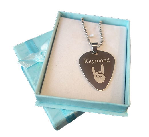 Gegraveerde RVS guitar pick plectrum in roestvaststaal hoogglans met ketting naar keuze. Ook rvs kettingen zijn verkrijgbaar voor een meerprijs. Maat guitar pick inclusief oog hoogte 4cm, breedte 2,9. cm.