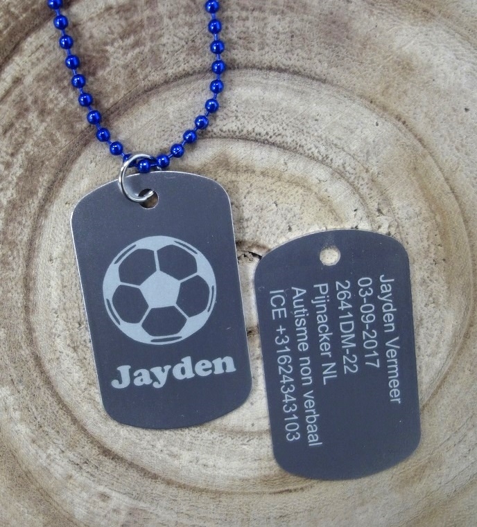 Het identiteitsplaatje is gemaakt van aluminium. Het universele kogelkettinkje zal bij te hoge belasting breken, dus is veilig voor jong en oud. U kunt kiezen uit een zilveren of een lichtroze tag. Ook sleutelring mogelijk!