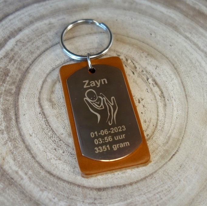 Sleutelhanger geboorte gegraveerd met afbeelding en gegevens RVS op leer
