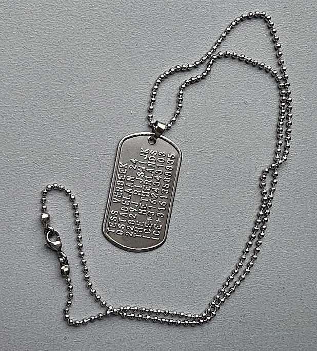 De prijs voor het identiteitsplaatje is inclusief RVS balletjes ketting met makkelijk te openen rvs karabijnslotje, de dogtag is bevestigd met een rvs bevestiging clipje. Lengte rvs balletjesketting is 62cm. Alle onderdelen van deze dogtag zijn gemaakt van 100% roestvrijstaal. Hier kunt u rustig mee douchen of zwemmen.