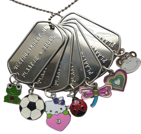 Leuk voor uw kind een identiteitsplaatje gecombineerd met leuke emaille hanger. U kunt kiezen uit: een voetbal, poesje met strass, aapje, libelle, hartje en lieveheersbeestje.  Bij weethoeikheet.nl 6 regels tekst mogelijk!