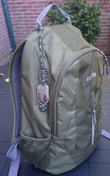 Je kunt met makkelijk aan een reistas, rugtas of koffer bevestigen door het paracord gedeelte met dogtag door de lus heen te halen.
