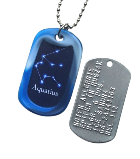 Aan de ene kant heeft u de mogelijkheid voor 12 afbeeldingen alle sterrenbeelden en aan de andere kant ponsen wij de tekst voor u naar keuze. Dit kunnen adresgegevens zijn, maar ook een andere tekst, zoals uw medische gegevens. Bij weethoeikheet.nl 6 regels tekst mogelijk! De foto is afgedicht met een kunststof vochtbestendige sticker.