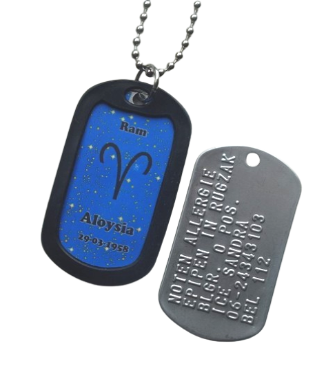 Het identiteitsplaatje is gemaakt van speciaal medisch roestvast edelstaal. Dit materiaal is anti-allergisch. Het universele kogelkettinkje zal bij te hoge belasting breken.