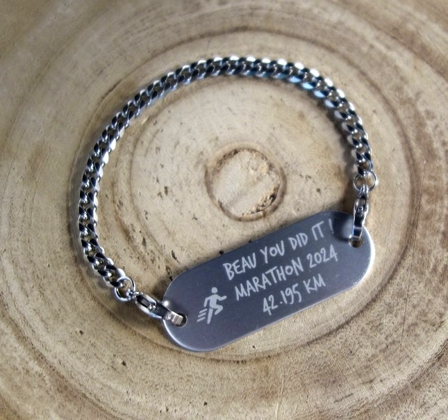 Maat plaatje: lengte 5cm, hoogte 1,8cm. Deze armband is niet geschikt voor kleine kinderen ivm maat tag en rvs schakelketting. Deze breekt niet bij wild spelen.