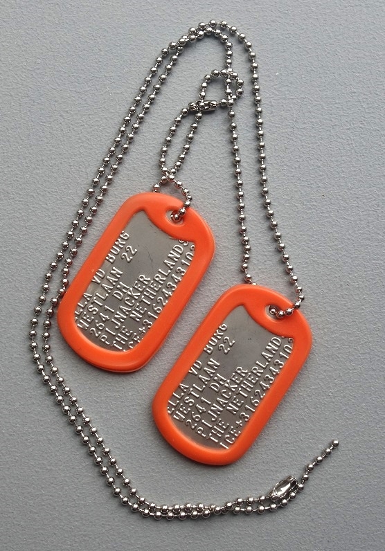 De dog tag is leverbaar in 30 kleuren! De dog tag is gemaakt van speciaal medisch roestvast edelstaal. Dit materiaal is anti-allergisch. Het universele kogelkettinkje zal bij te hoge belasting breken. Bij een U.S. Army Dog Tag ontvangt 1 ketting van 13 cm en 1 ketting naar keuze.