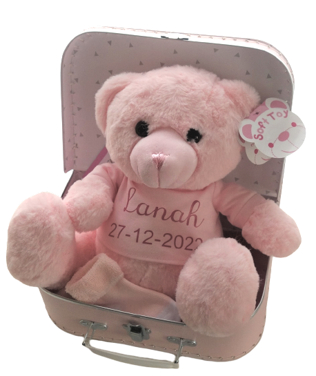 T-shirtje kan met een naam (zie beer in koffer) of een naam in hart of ster bedrukking of een naam en een geboortedatum.