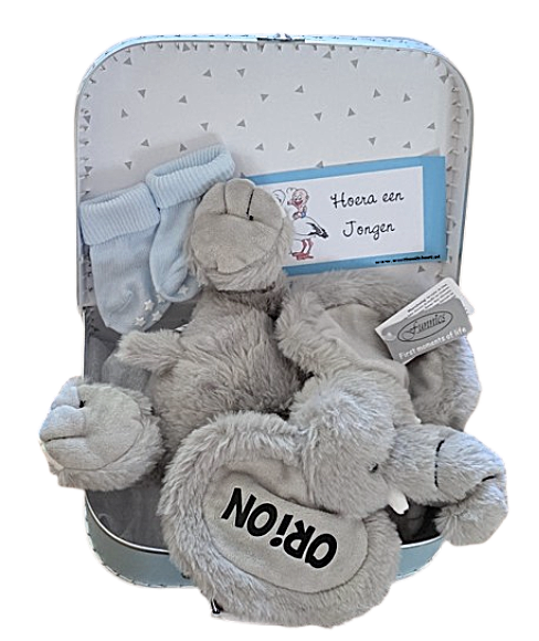 Koffertje hebben wij in diverse kleuren, voor de inhoud kunt u kiezen uit drie zachte babyknuffels van het merk Funnies, die in het oor worden bedrukt. Keuze knuffels: olifant, konijn of schaap.