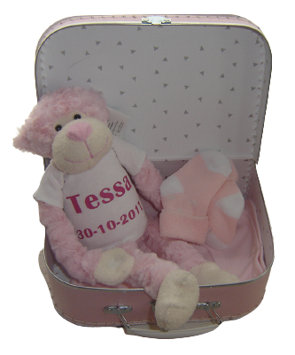 Geboortekoffertje met naam en geboortedatum gevuld met gepersonaliseerde kraamcadeau's koffertje 5.