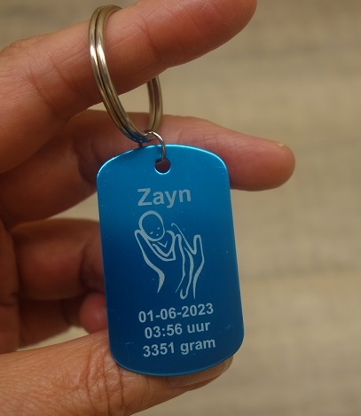 Leuk als cadeautje voor jezelf, familieleden of vrienden. Op deze sleutelhanger kunt u naam, geboortedatum, tijd en gewicht kwijt. Keuze kleur dogtag: zilver, goud, lichtroze, turqoise licht blauw.