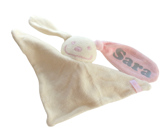 Leuk als cadeau voor uw eigen zoon of dochter of als cadeau voor   een ander. Tutdoek konijn bedrukt met naam in oor. Kleur van onze konijntjes is niet wit maar gebroken wit/cream.