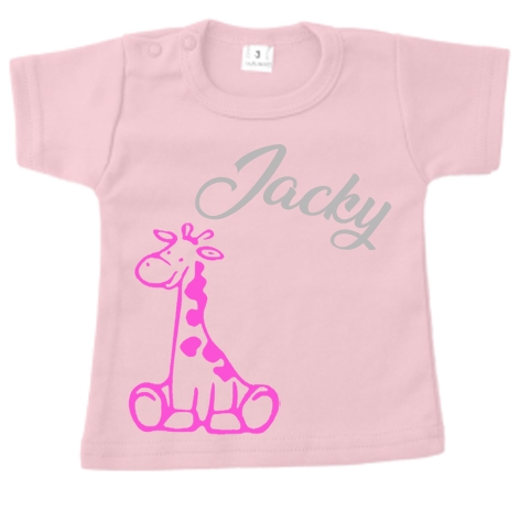 Baby t-shirt girafje simpel en naam kost bij ons € 12,95 exclusief verzendkosten.