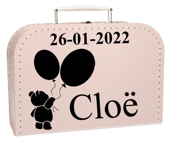 Koffertje wordt bedrukt met een beer met ballonnen, naam en een geboortedatum. Wilt u geen geboortedatum, laat het veld datum dan leeg.