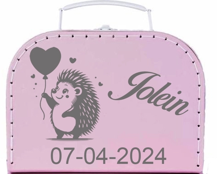 Koffertje wordt bedrukt met egeltje, naam en eventueel een geboortedatum.