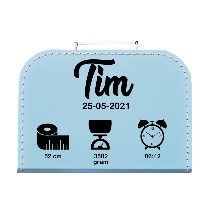 Koffertje wordt bedrukt met een afbeelding meetlat, weegschaal en klokje, een naam, geboortedatum en overige geboortegegevens.