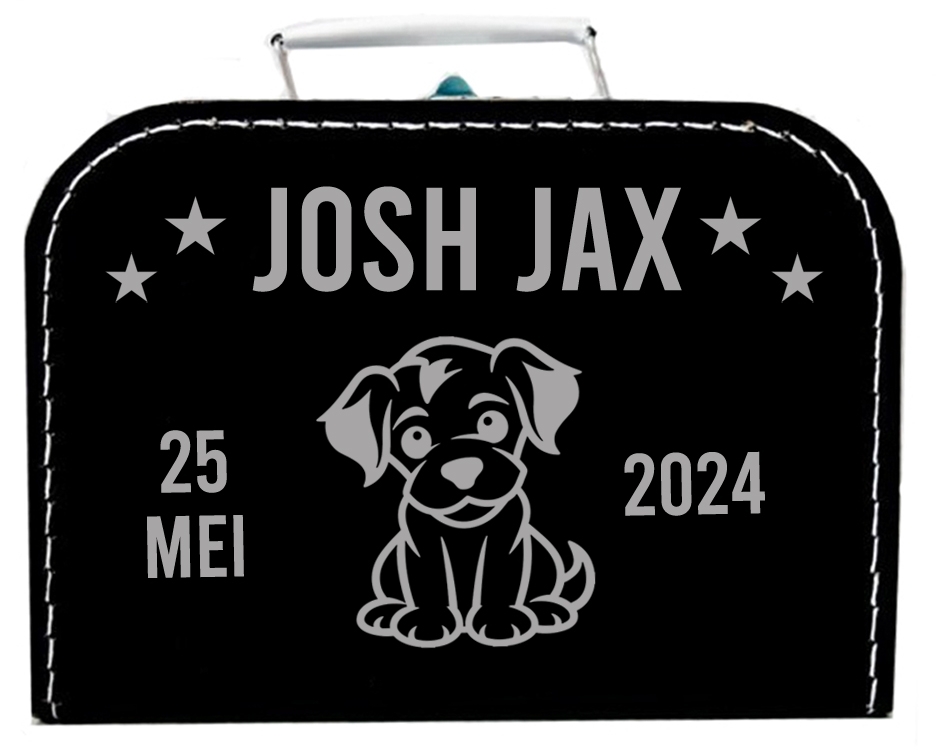 Koffertje wordt bedrukt met een afbeelding hondje/sterren, geboortedatum en met naam.