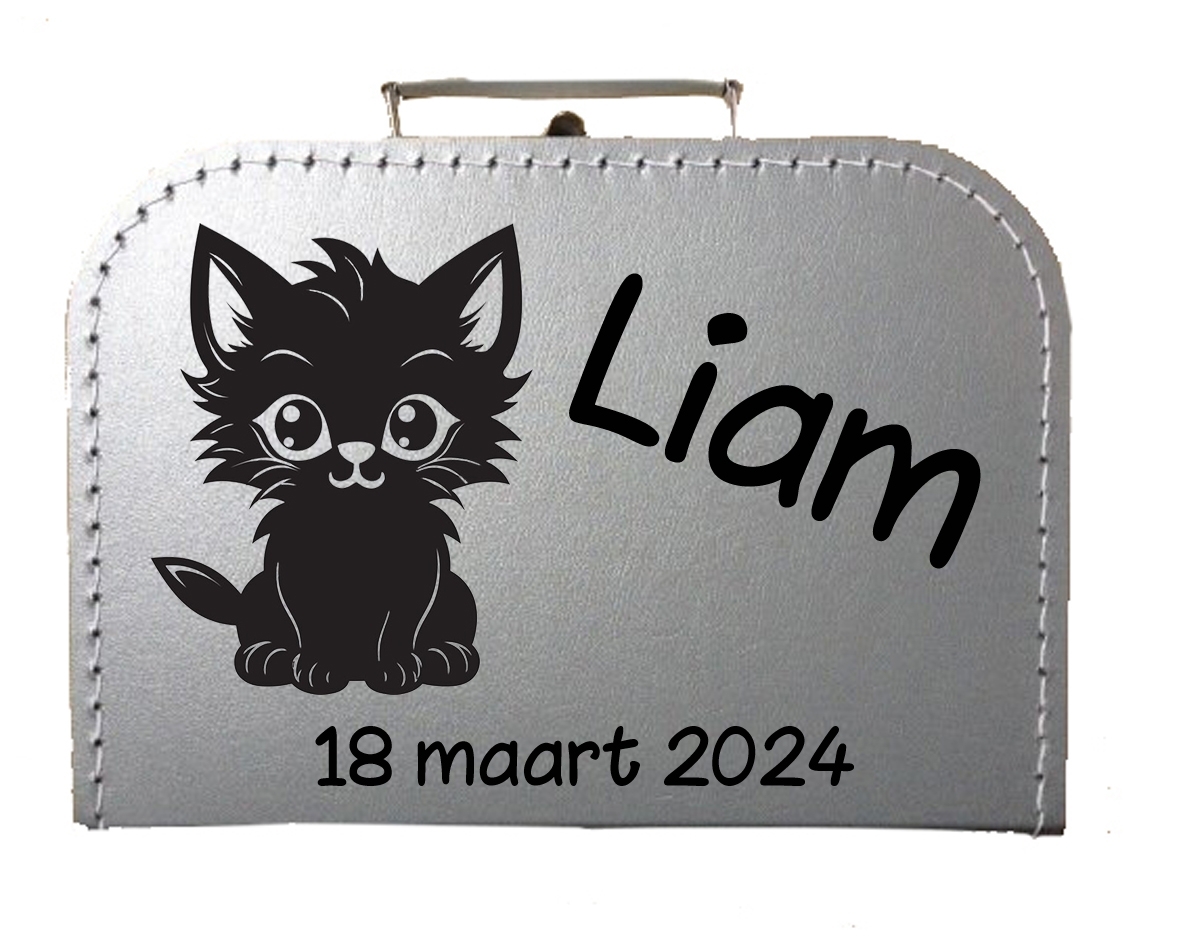 Koffertje wordt bedrukt met een poesje, naam en een geboortedatum. Wilt u geen geboortedatum, laat het veld datum dan leeg.