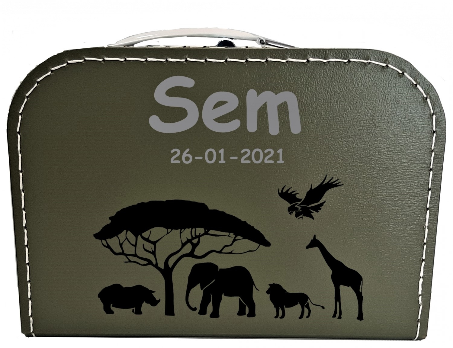 Geboortekoffertje Wild Life waar u de naam en geboortedatum in kwijt kunt. Dit koffertje is te bestellen in de kleuren: lichtroze, lichtblauw, fuchsia roze, zilvergrijs, okergeel, zwart en groen.