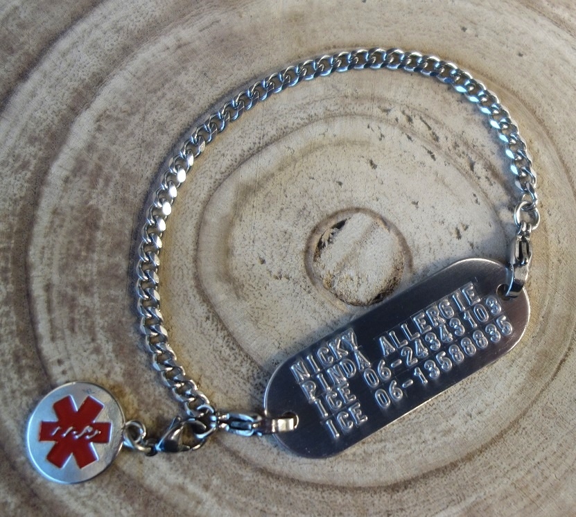 Armband met geponste aluminium tag met medisch teken en tekst naar keuze. U kunt op deze armband kwijt 4 regels tekst á 15 tekens per regel. Armband wordt op uw maat gemaakt, alle onderdelen zoals: sluiting, ketting, bedel en rvs klikslotjes zijn gemaakt van roestvaststaal. Meest geschikt voor volwassenen en tieners. Voor kleine kinderen is dit plaatje te groot. Maat plaatje:5cm lang bij 1,8 breed.
