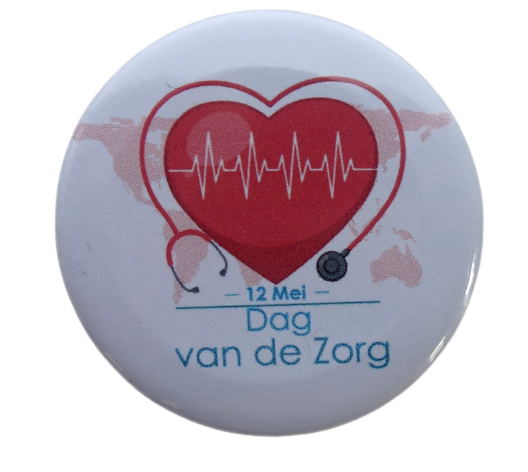 De button wordt standaard geleverd in 5 cm. U kunt kiezen uit drie buttons: Dag van de zorg, dag van de verpleging en dag van de mantelzorg.