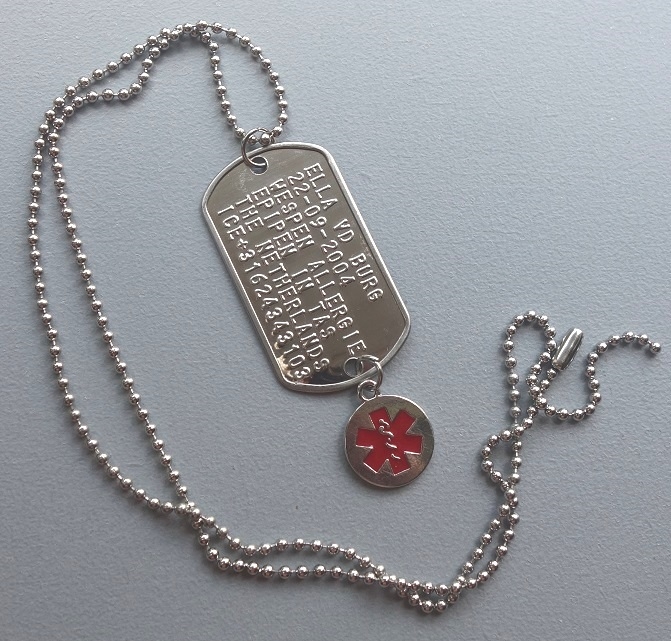 Het identiteitsplaatje is gemaakt van speciaal medisch roestvast edelstaal. Dit materiaal is anti-allergisch. Het universele kogelkettinkje zal bij te hoge belasting breken, dus is veilig voor jong en oud.