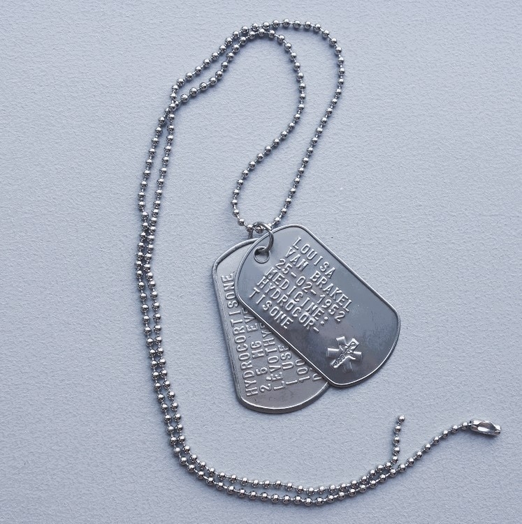 Medische dogtag: eerste plaatje met medisch teken, erachter een rvs plaatje. Zo kunt u extra veel medische informatie kwijt. Op het eerste plaatje met medisch teken kunt u minder tekst kwijt dan het 2e plaatje. Hierop kunnen 6 regels a 15 posities per regel.