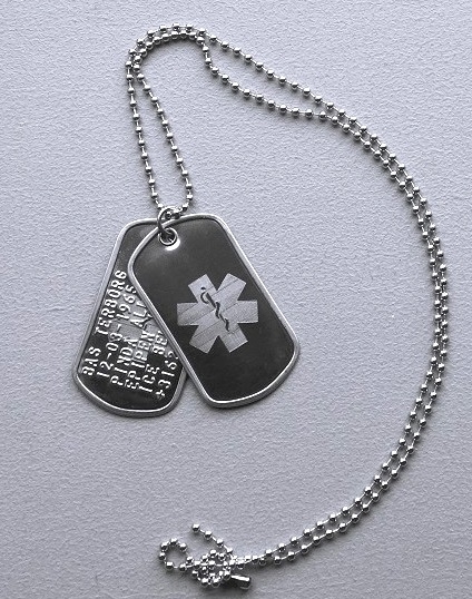Medische RVS dogtag: eerste plaatje met medisch teken gegraveerd, erachter een rvs plaatje gegraveerd met een medisch teken en geponst met 6 regels tekst. Hierop kunnen 6 regels a 15 posities per regel.