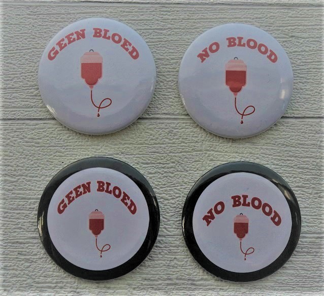 Geen bloed/No Blood button online bestellen, doet u hier! Deze is in het Nederlands en Engels te bestellen.