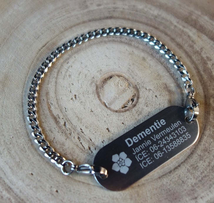 Armband Alzheimer of Dementie gegraveerd  met tekst naar keuze. U kunt op deze armband kwijt 3 regels tekst á 16 tekens per regel.  Maat plaatje:5cm lang bij 1,8 breed.  Armband tag is gemaakt van aluminium, de armband en onderdelen zijn gemaakt van roestvaststaal.