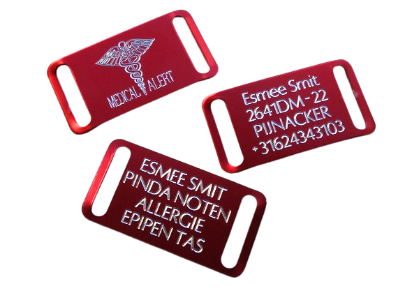 Op dit plaatje kunt u op de voorkant een medisch teken laten graveren en op de achterzijde vier regels tekst. Rode voorbeeldmodel gegraveerd met Optima.  Alle overige lettertype's op script na, zijn zeer goed leesbaar op de achterzijde.
