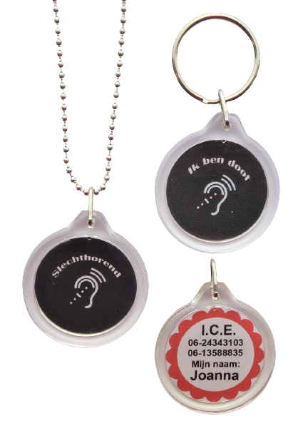 Voorzijde keuze doof of slechthorend oor. Aan de achterzijde kunt u een naam en twee telefoonnummers kwijt. Mag ook een andere tekst zijn.