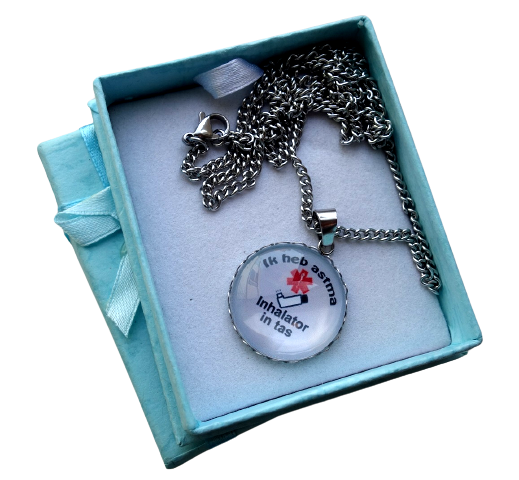 Mooie RVS hanger en ketting, verkrijgbaar in twee uitvoeringen: ASTMA of COPD met een ICE telefoonnummer. Foto is met flits genomen, kleur achtergrond is effen lichtgrijs. Foto doet iets gevlekt aan.