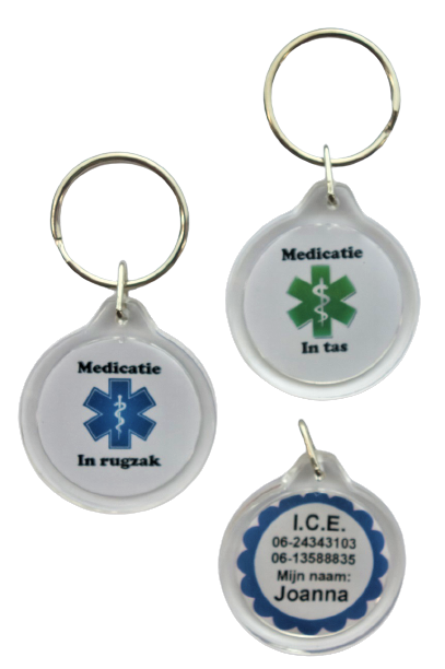 Medische sleutelhanger medicatie in tas/rugzak eigen tekst 2-zijde